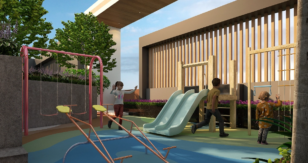 Safe, secure and vibrant, this cosy yet happy kids’ play area lets your little ones to run around without bothering about the traffic. And you get to see their happy faces, while sitting peacefully around them.