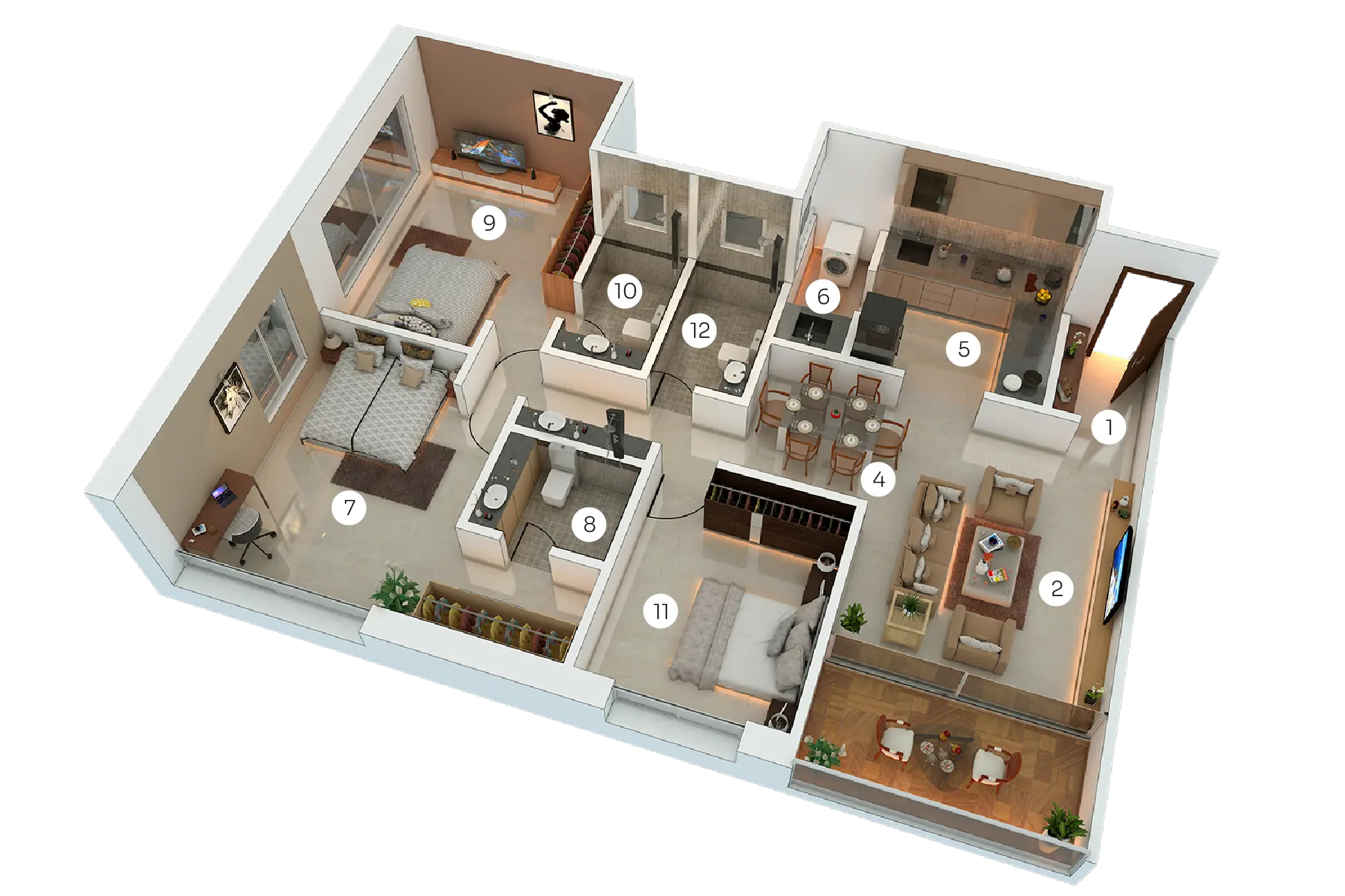- 4 Light points, 2 fan points, 5 nos of 5 Amp plug points in the living room